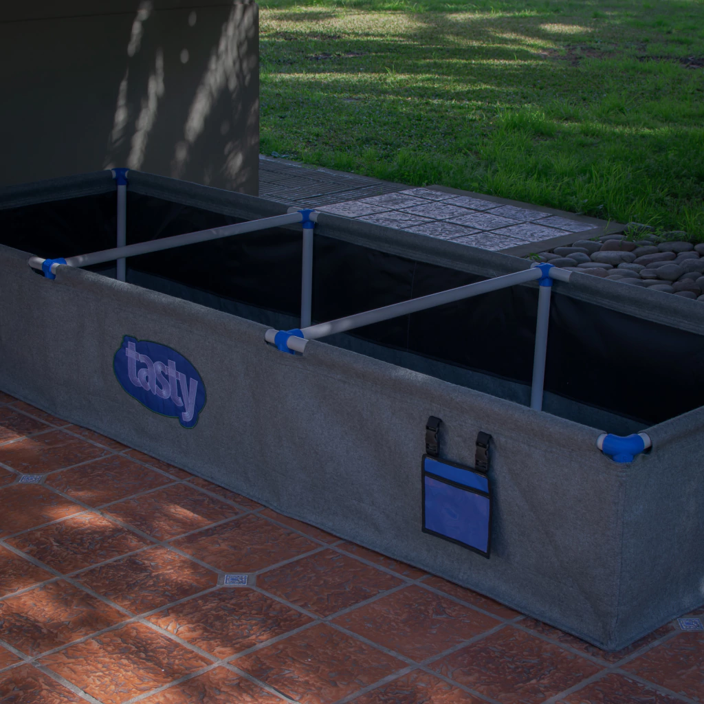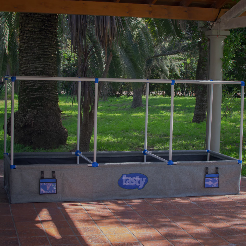 Nuestra cama de cultivo de 1400 litros está pensada para cultivos intensivos en suelo vivo, tanto en interior como exterior. Confeccionada en tela geotextil de alta resistencia, permite un excelente desarrollo radicular y respiración del sustrato. Su estructura se arma con caños de PVC de 32 mm, esquineros y acoples impresos en 3D de diseño TASTY, que le otorgan firmeza y durabilidad.